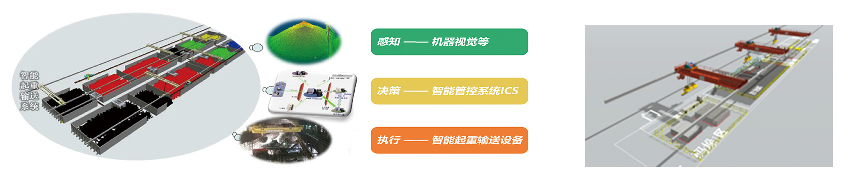 智能起重輸送是包含了庫區(qū)管理、調(diào)度算法、智能搬運等子系統(tǒng),形成了感知、決策、執(zhí)行的智能化整體解決方案。該系統(tǒng)在標準的生產(chǎn)流程、規(guī)范的操作過程的基礎(chǔ)上,通過位置傳感器、機器視覺等感知設(shè)備狀態(tài)、庫存狀態(tài)等環(huán)境信息,經(jīng)庫區(qū)智能管理系統(tǒng)分析后自主分解生產(chǎn)計劃,通過智能調(diào)度、路徑規(guī)劃等技術(shù)形成運行指令,通過自主控制、精確定位等技術(shù)由智能設(shè)備自主完成任務(wù)指令并反饋執(zhí)行結(jié)果。該系統(tǒng)還具有遠程運維、云服務(wù)及移動推送等功能,實現(xiàn)全生命周期管理和現(xiàn)場實時監(jiān)控。