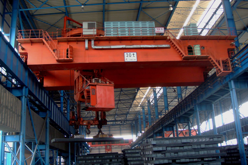 板坯夾鉗起重機(jī)(又稱板坯搬運(yùn)起重機(jī))是搬運(yùn)板坯特別是高溫板坯的專用設(shè)備。大連重工研制的板坯夾鉗起重機(jī)有四大類,分為:板坯夾鉗、鋼板夾鉗、鋼卷夾鉗、鋼錠夾鉗,共十幾種機(jī)型,規(guī)格包括:20t、30t、36t、40t、45t、50t、56t、63t、70t、94t、100t 。